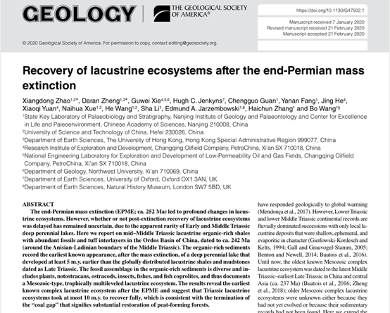 直到近日,由中国科学院南京地质古生物研究所“现代陆地生态系统起源与早期演化研究团队”的研究生赵向东和郑大燃博士在王博研究员和张海春研究员的指导下,与长庆油田解古巍工程师等合作,基于科研团队十年来的野外积累和室内分析工作,提出二叠纪末大灭绝之后湖泊以及森林生态系统最多用时1000万年就完成了恢复。