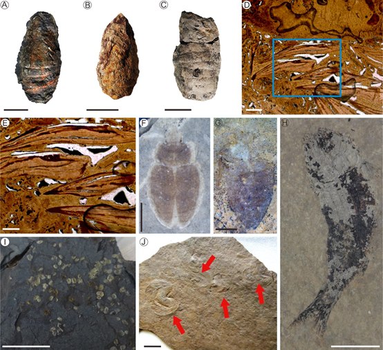 剖面产出的各类代表性化石。A-C, 鱼粪;D-E,鱼粪切片;F和G,甲虫;H,鱼;I,介形虫;J,鲎虫。(图片来源:作者提供)