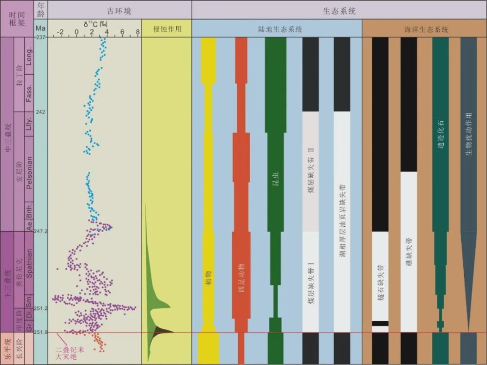 研究者推测,早三叠世炎热的气候会限制湖泊中的溶解氧含量,从而阻碍了生态系统的复苏。然而,在安尼期海洋中,碳埋藏的大量增加则可能会导致大气CO2含量下降和全球降温,从而改善了湖泊的生态条件。