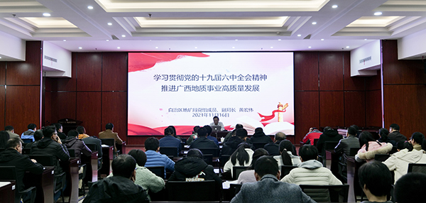 他指出,当前地勘单位正处于改革发展的关键时期,全队上下要深入学习、全面领会党的十九届六中全会的精神实质,把学习好、宣传好、贯彻好全会精神作为当前和今后一个时期的重大政治任务,要把学习全会精神与学习习近平总书记视察广西时的重要讲话精神相结合,与开展党史学习教育相结合,与开展各项工作相结合,贯穿全队高质量发展全过程,推动全会精神在全局地勘单位间落地生根、开花结果,奋力谱写地矿事业科学发展新篇章。