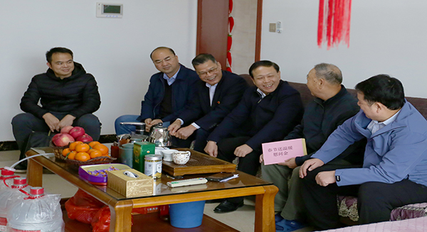 在退休职工秦国设家,唐善茂给他送上慰问金和慰问品,并亲切地和他交谈,详细询问他的工作经历,得知秦老一家两代地质人为地质事业做贡献时,唐善茂表示赞赏。唐善茂仔细询问秦老的身体状况,得知他身患疾病,唐善茂叮嘱他要遵医用药,安心休养,保持良好的精神状态,并向他致以节日的问候和新春的祝福。