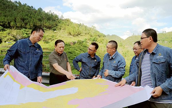 唐善茂率调研组先后来到由地调院承担的“广西靖西市三合沉积型铝土矿普查”、三队承担的“广西德保县登晒—多宋矿区铝土矿普查”、四队承担的“广西德保县登力—田阳古美矿区沉积型铝土矿普查”、二七四队承担的“平果铝土矿教美和大隆矿区生产勘探”等项目野外一线,详细了解铝土矿勘查施工情况,认真查看含矿露头。与项目一线地质技术人员座谈交流,了解项目进展成效,研究探讨矿产勘查困难对策,倾听基层一线职工心声,鼓励大家要心怀“国之大者”,全身心投入国家资源安全保障工作,以丰富的找矿成果,展现新时代地质工作者的使命担当。