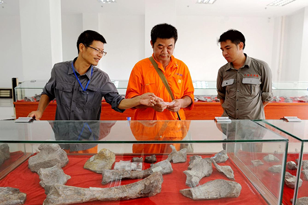 技术人员在整理搜集到的恐龙化石(杜小品 摄)