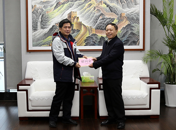 唐善茂(右)为“广西工匠”钟亩锋送上慰问金