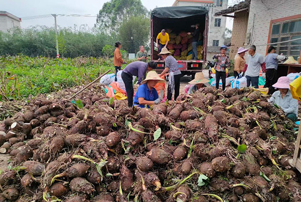 在道西村香芋种植农场,随着挖香芋人群来回穿梭,一堆堆刚挖出来的香芋摆满田间地头,个个体态饱满、香气飘扬,村民忙着挑拣、装袋、装车,一派繁忙的丰收景象。“多亏了地矿局的帮助,今年又是一个丰收的好年。”望着一整天的劳动成果,农户们脸上都笑意满满地夸赞道。