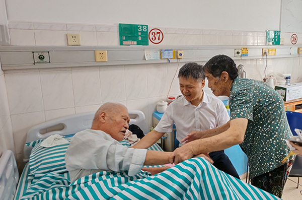 在三一〇医院,黎四龙详细询问陈大贤的生活情况、健康状况、日常照护和困难需求等情况,并感谢老人多年来为地矿事业所作的贡献,向老人致以节日的问候和诚挚的祝福,鼓励老人继续保持积极向上的生活状态,保重好身体。
