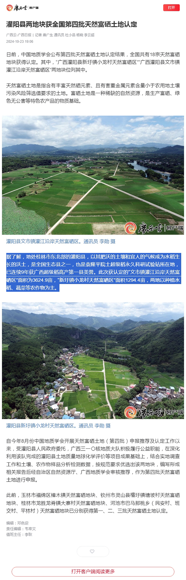 日前,中国地质学会公布第四批天然富硒土地认定结果,全国共有18宗天然富硒地块获得认定。其中,“广西灌阳县新圩镇小龙村天然富硒区”“广西灌阳县文市镇灌江沿岸天然富硒区”两地块位列其中。
