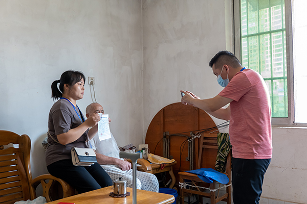 工作人员在对行动不便的老人开展上门认证服务(潘仲明/摄)