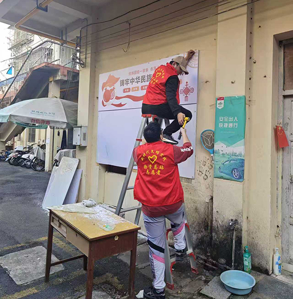 活动现场,志愿者们分工明确、协作默契,有的仔细铲除旧公告栏的残留胶水与破损板材,有的精准测量定位进行组装固定,动作娴熟利落。全新的公告栏安装完成后,不仅让社区环境焕然一新,更成为展示民族团结风貌的“新窗口”。